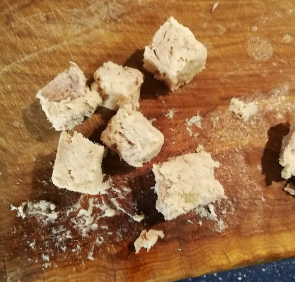 Como la carne tiene mucha gelatina cuando está fría, podemos cortar unos cubitos, los moldeamos un poco con el cuchillo y reservamos en el frigorífico.