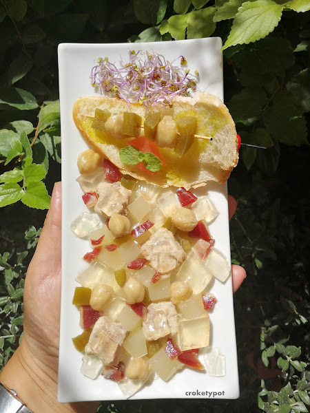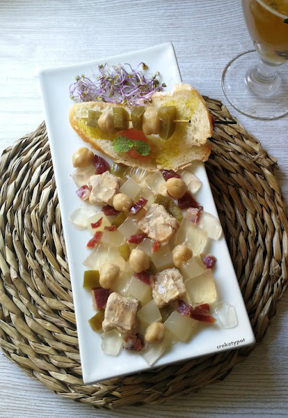 En la fuente de servir, aleatoriamente ponemos los cubitos de carne "pringá", los dados de caldo, los dados de agua de tomate, pimiento encurtido cortado a trocitos, jamón serrano picado, y los garbanzos del cocido a temperatura ambiente.