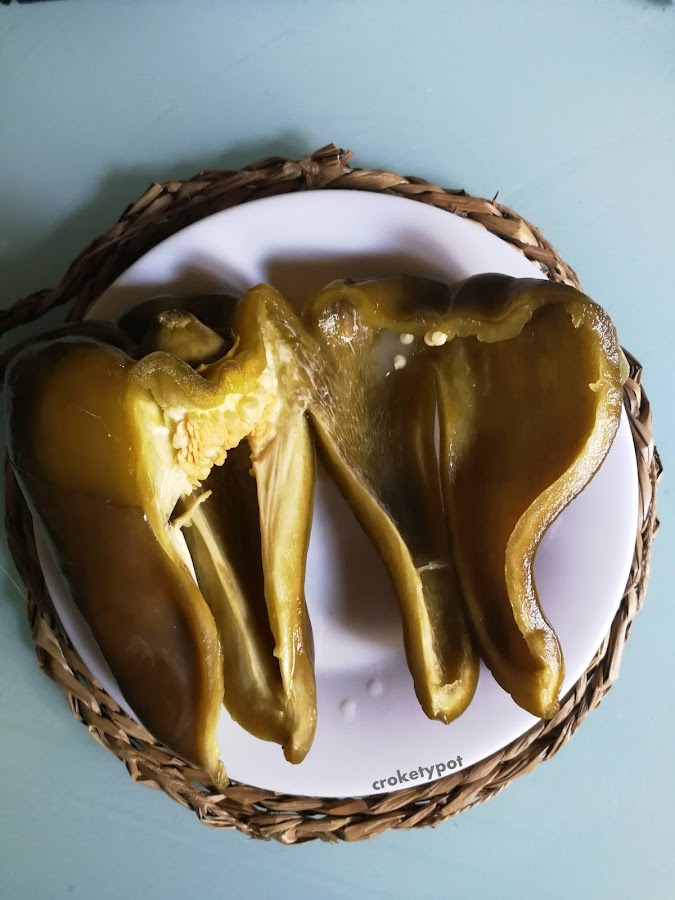2 pimientos verdes carnosos grandes (no pimiento italiano), 900 ml de agua, 60 gr. de sal, 60 ml de vinagre. Mantendremos esta proporción, para que queden siempre cubiertos de líquido, los tendremos en un recipiente cerrado y sin luz y siempre sumergidos en el líquido, 15 días, hay que tener en cuenta que no puede hacer mucho calor, lo suyo son hasta 15º, para evitar una fermentación muy rápida o que se contaminen. Si no habéis probado con las fermentaciones os recomiendo que no hagáis experimentos. Podéis sustituir el pimiento en vinagre por otro vegetal en vinagre que más os guste.