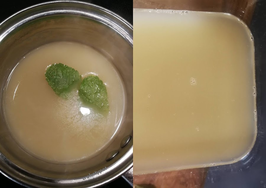 Pondremos a hidratar las hojas de gelatina, calentamos el caldo a fuego flojo, añadimos las hojas de hierbabuena, y un chorreón de vino. Cuando las hojas están hidratadas las añadimos al caldo, movemos bien hasta que se deshagan. Retiramos del fuego y lo reservamos en un recipiente de cristal a enfriar 3 o 4 horas en el frigorífico.