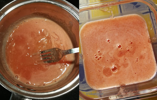 Pelamos los tomates, los ponemos en el vaso de la batidora junto con el ajo, el comino y la sal, trituramos los pasamos a un colador sobre un cazo y dejamos que se filtre todo el jugo del tomate. Cuando lo tenemos lo ponemos en el fuego que tome un poco de calor, añadimos la gelatina, se mueve y cuando vemos que se ha deshecho, se retira del fuego y ponemos a enfriar 3 o 4 horas en el frigorífico.