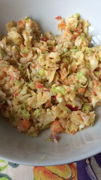 En una picadora, troceáis todos los ingredientes en trozos pequeños. Podéis hacerlo con la picadora tipo la 1-2-3 de Moulinex o con el accesorio que suelen traer las batidoras eléctricas. Si tenéis paciencia y un buen cuchillo también sirve! Una vez cortado todo, añadís la mayonesa, el aceite, la sal y el azúcar.