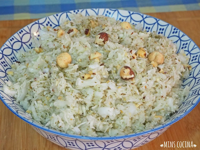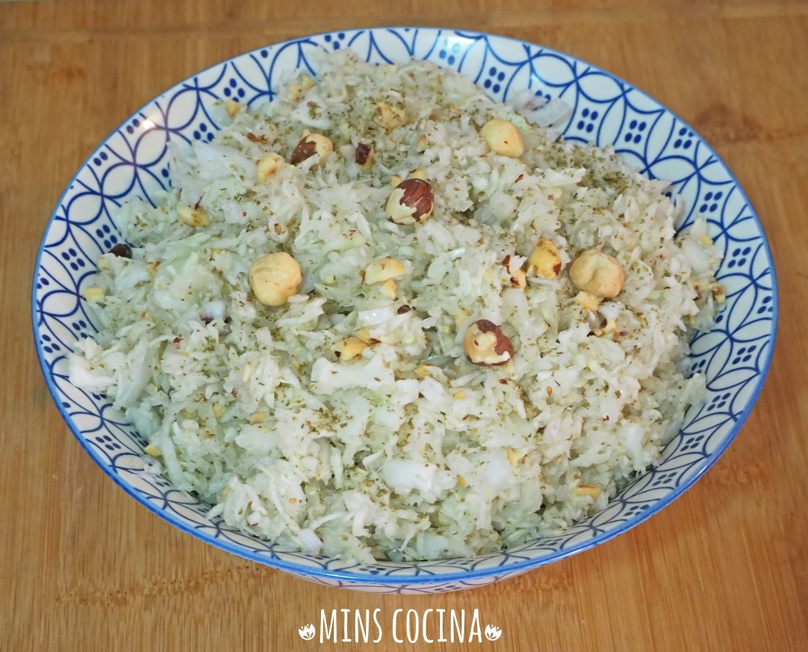 Hace unos días tenía un una col en la nevera que llevaba ahí ya algún tiempo. No me apetecía hacer lo de siempre, cocer la verdura, rehogarla, etc... De pronto recordé que cuando este verano estuvimos en Uzbekistán, de luna de miel, entre otras muchas cosas deliciosas probamos un montó de ensaladas. En muchas de ellas añadían col y recuerdo una en concreto, que la llevaba cruda y sin aliñar, solo con especias, aunque no recuerdo exactamente cuáles. El tema es que recuerdo que tanto a mi marido como a mí nos encantó. Estaba sabrosa, muy crujiente y fresca. Así que decidí inventarme algo parecido. Como no recordaba qué especias llevaba, me decidí a poner zaatar que pensé que le iría bien y me encanta. Los frutos secos también le irían bien. Y nada más! Y aunque parezca sorprendente quedó estupenda. No necesita nada. Lo tienen todo: sabor y textura perfectos!