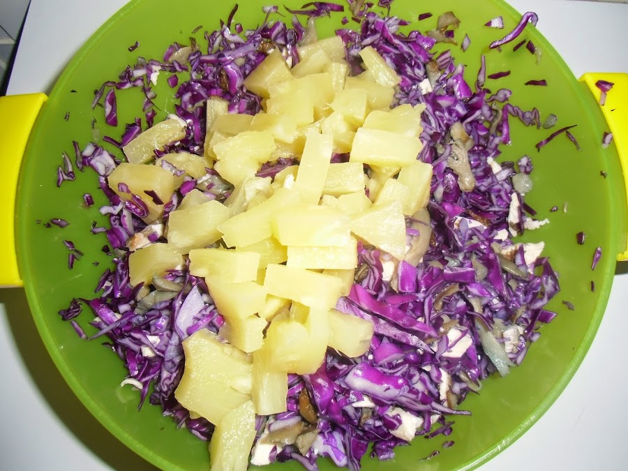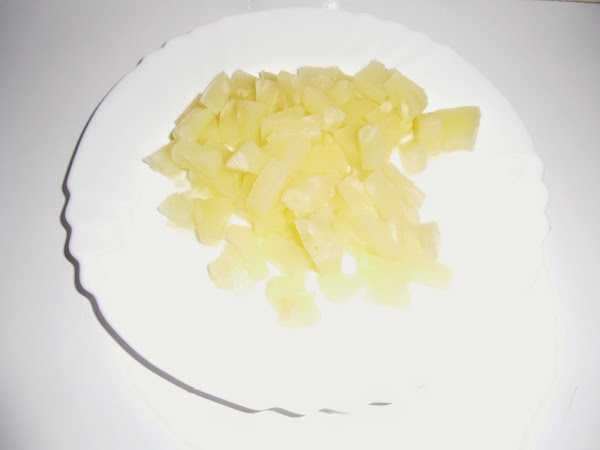 Ahora cortamos la piña en trozos y la incorporamos con el resto de ingredientes