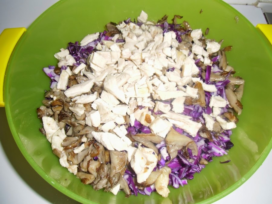 En una sartén con unas gotas de aceite hacemos las setas ya cortadas con un poco de sal y pimienta y lo mezclamos con la lombarda.