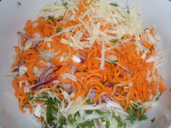 - Añadimos la salsa a las verduras y mezclamos muy bien. La ensalada ya está. La metemos en la nevera y dejamos reposar unas horas o toda la noche. Se saca un rato antes de comer y lista. Una ensalada de col bien rica y fresquita! Véis qué fácil?!