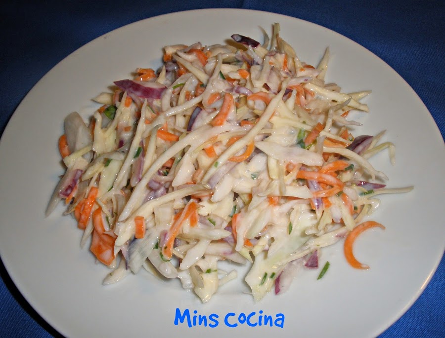 La palabra coleslaw viene del holandés "koolsla", o sea, ensalada de col. Y es que la palabra llegó a América a través de los holandeses que migraron a New York en 1700s. Lo que estoy aprendiendo con esto de la cocina! :-)