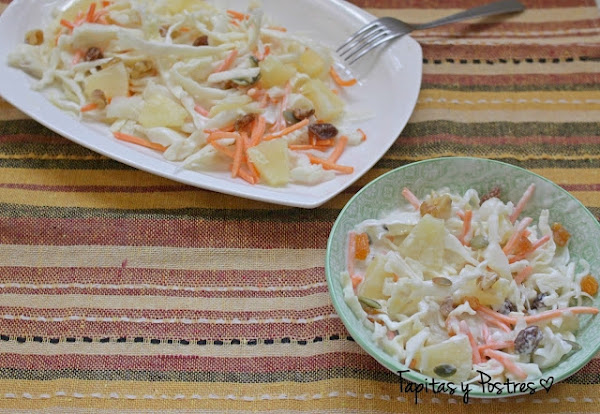 Para aprovechar una media col que me sobró de otra receta, preparé esta ensalada con cierto aire tropical.