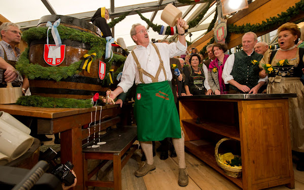 OZapft is! Con este grito dado por parte del Primer Ciudadano de Múnich (o sea sé, el alcalde) que portando un gran mazo de madera, rompe el primer barril de cerveza del año, se procede oficialmente al inicio de esta célebre fiesta bávara. Viene a ser la frase mágica que todos en estas fechas esperan y que significa algo parecido a: "...ya está abierto, que comience la fiesta!!"