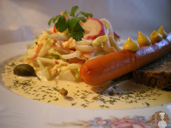 No es la versión más ortodoxa de dicha ensalada pero sí la que más nos gusta en casa, para tomarla con unas salchichas o simplemente, tal cuál. Es importante dejarla reposar en frío al menos 12-24 horas una vez elaborada para disfrutarla con todo su sabor.