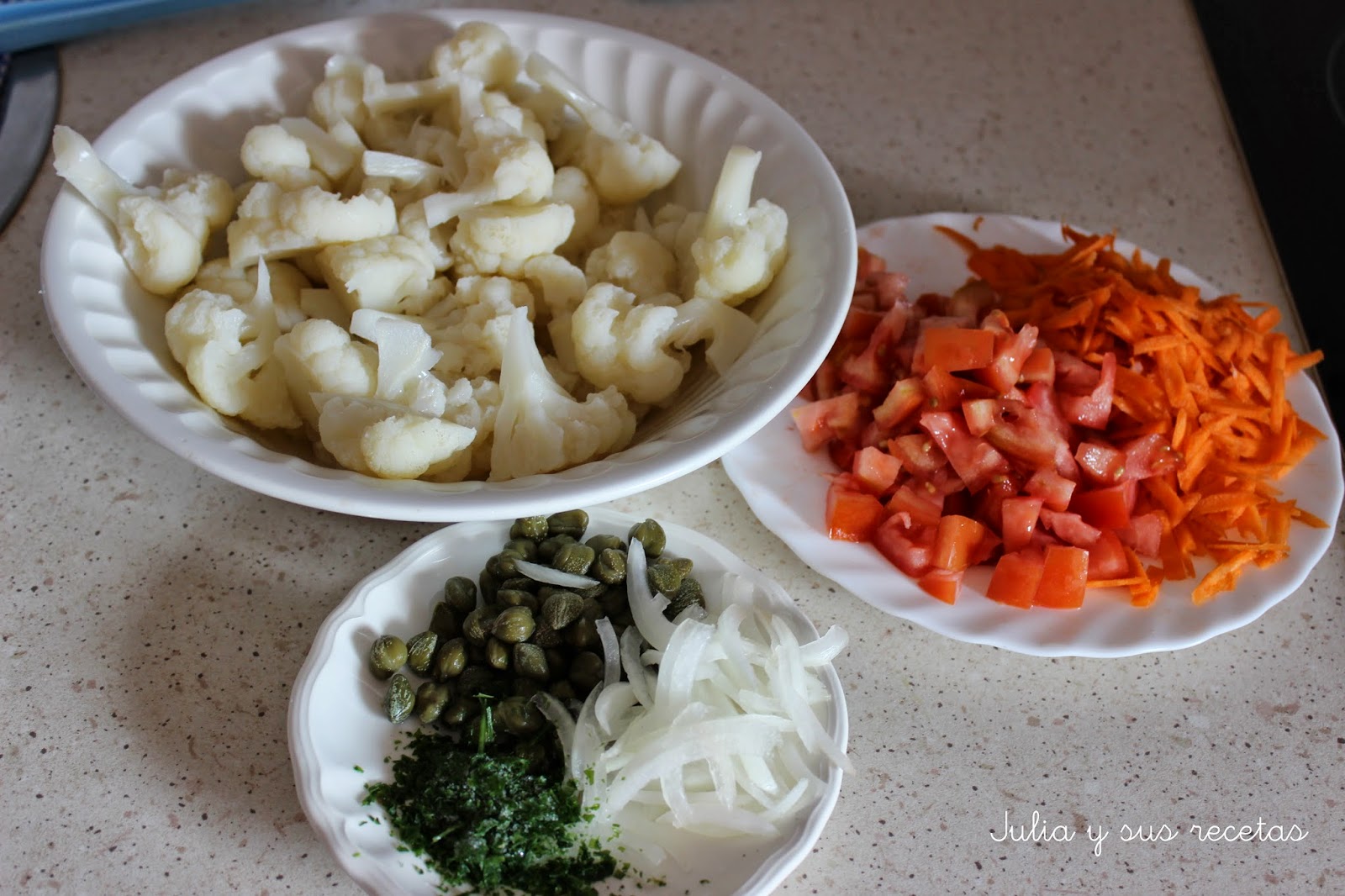 Partimos la coliflor y la cocemos en agua con una poquita sal hasta que esté "al dente". La escurrimos y ponemos en un bol.