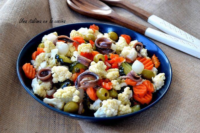 Pon en un bol todas la verduras que has cocinado. Añade cebollitas en vinagre, alcaparras, aceitunas y filetes de anchoas. Condimenta con aceite v.e., pimienta y eventualmente sal.