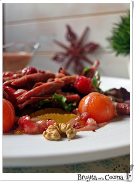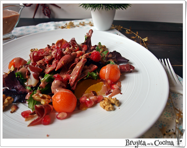 Pues por navidad me gusta preparar una ensalada distinta con algún ingrediente un poco especial y fruta, siempre fruta y principalmente exótica porque creo que le da un toque más de fiesta. Mi propuesta de este año es con pato en confit y jamón, las frutas rojas y naranjas y una vinagreta que quita el sentido, todo combina a la perfección, por lo menos en casa la respuesta tras probarla ha sido, Muy buena!! Si quereis ver otras ideas pasad por aquí o dad una vuelta por el blog.