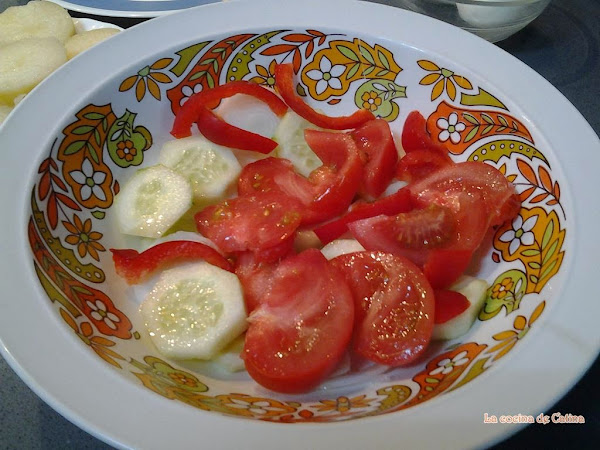 La cebolla, los tomates, el pepino y el pimiento limpio de semillas los cortamos en aros.