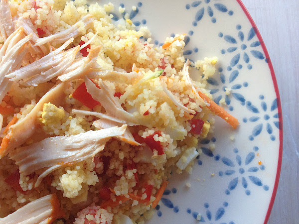 1. Preparamos el cuscús siguiendo las instrucciones del envase. Normalmente se añade el mismo de volumen de agua {o caldo} a punto de hervir que de cuscús. Se deja reposar unos 3 minutos y se mezcla con un poco de aceite de oliva con ayuda de un tenedor, para que quede suelto.