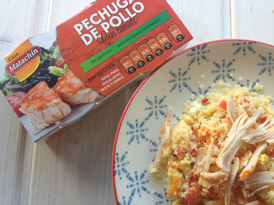 En esta ocasión tenía unas latitas de pollo en salsa de tomate de Casa Matachín que vinieron en la última caja Degustabox y, por supuesto, no desaproveché la oportunidad de añadirlo a esta ensalada. Ya en otra ocasión había probado la pechuga de pollo en aceite de esta misma marca, y nos había gustado, así que tenía ganas de comparar. La pechuga de pollo en salsa de tomate tiene un sabor bastante sutil, y resulta, si cabe, más jugosa. Estas latas me encantan, me resultan comodísimas de tener en casa sobre todo para las ensaladas, es una manera ideal de ir variando sin complicarse la vida.