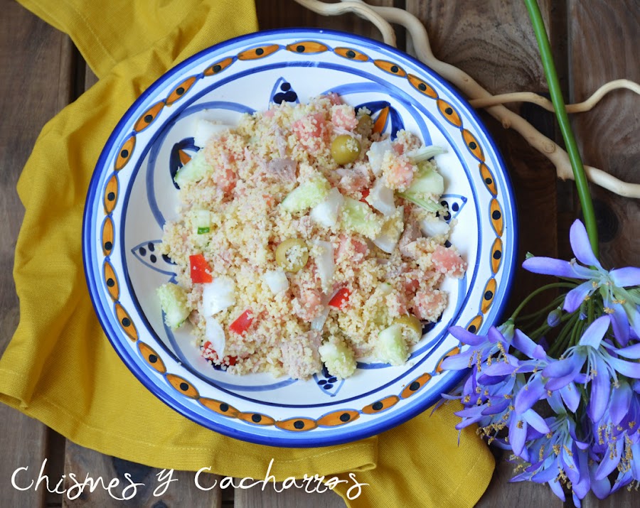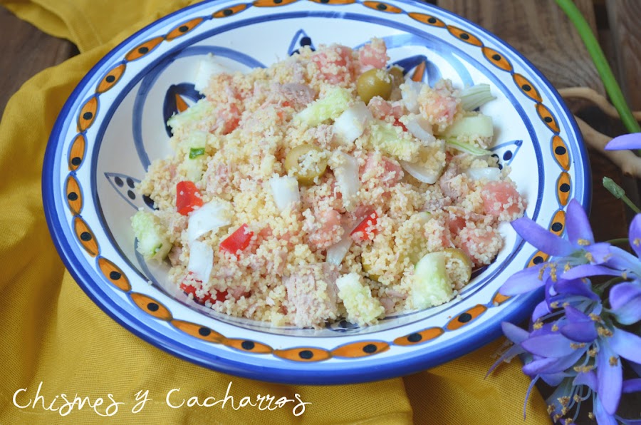 Mientras cortamos en trozos el pepino, el tomate y el pimiento. La cebolleta en juliana, poner todo en una ensaladera grande. Cortar las aceitunas por la mitad y añadir al resto. Cuando el cuscus este listo y templado mezclar con el resto de ingrediente. Aliñar con zumo de limón, aceite y sal. Tapar con papel film y dejar reposar hasta que esté bien frío.
