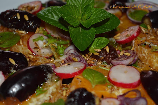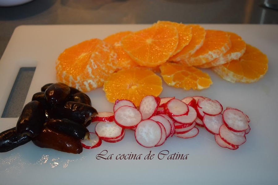 Colocamos las naranjas con el resto de los ingredientes en una ensaladera grande poco profunda.