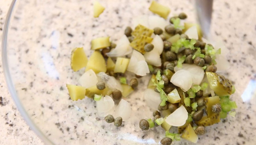 En un recipiente, echa, picados al gusto, los pepinillos y las cebolletas. Incorpora también las alcaparras, en este caso enteras, y las piparras también picadas. Reserva.