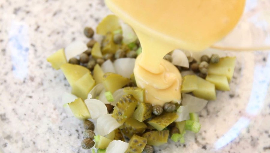 En otro recipiente, prepara la salsa mezclando bien hasta integrar los 3 ingredientes que la conforman: la mayonesa, la mostaza y la miel. Una vez hecha, añádela sobre los encurtidos reservados y remueve bien.