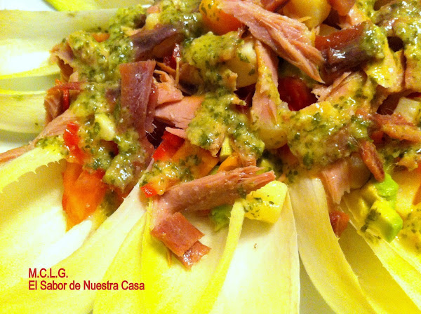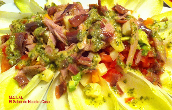 Mi amiga Mª Luisa, nos ha vuelto a deleitar con una de sus exquisitas ensaladas. Es muy completa y verdaderamente es un placer tomar estas "gondolinas", como ella las llama.