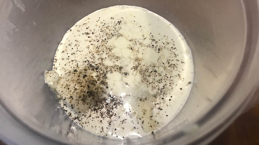 En un vaso de la trituradora introduce el queso roquefort, la nata (crema de leche) -crema de leche-, sal, pimienta negra molida y zumo de limón (al gusto) y tritura.