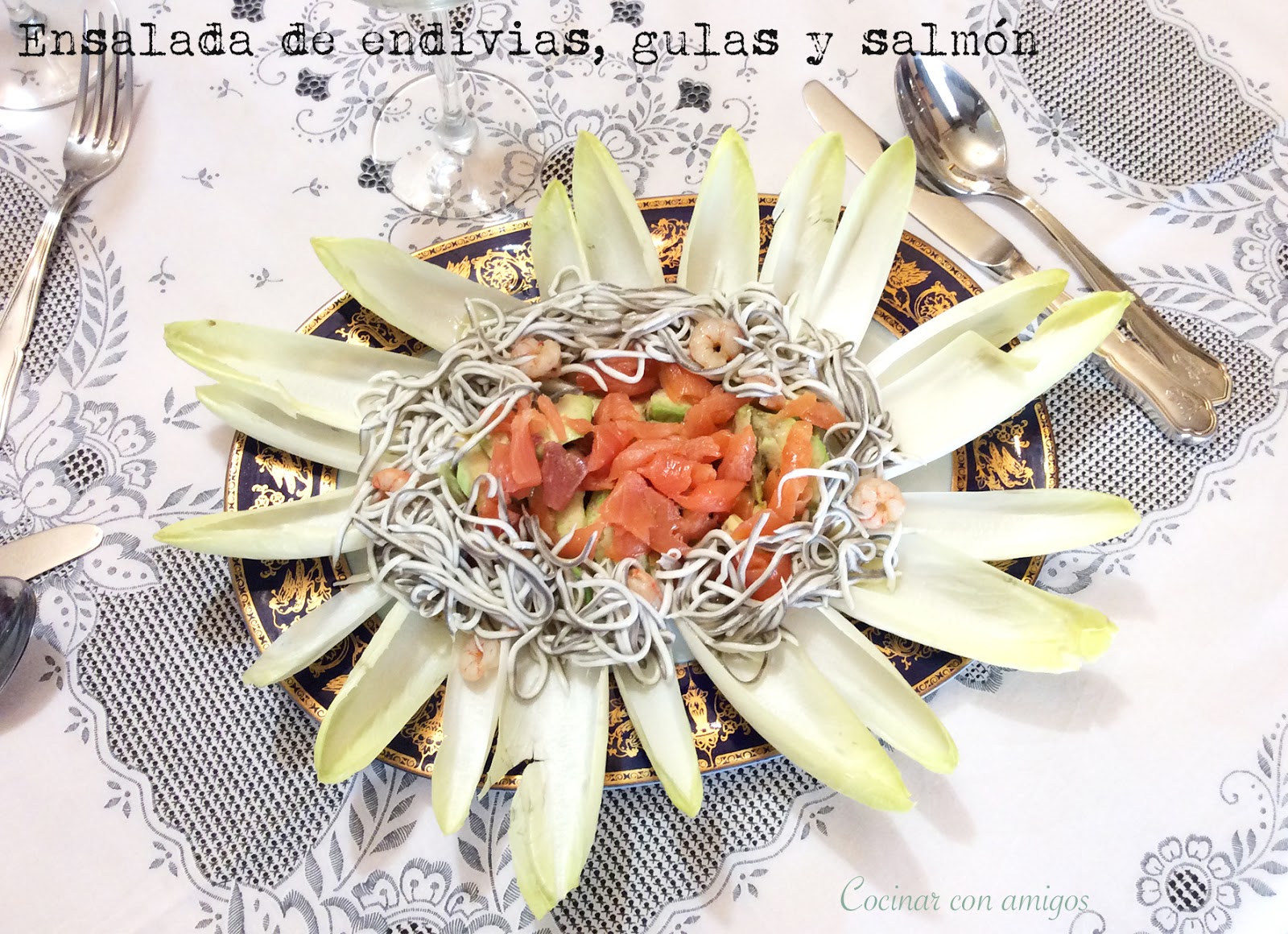 Esta ensalada de endivias, angulas sucedáneas y salmón es muy sencilla de preparar y sorprenden sus diferentes texturas, 100% recomendable.
