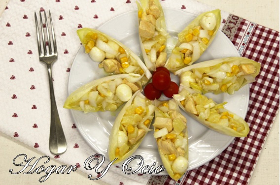 Las endivias, para quienes no las hayáis probado, son parecidas a la lechuga pero de sabor más amargo, sus hojas tienen forma cóncava y están muy apretadas. Como la mayor parte de las verduras, poseen mucha agua y pocas calorías, así que si estáis pensando en uniros a la "fiebre de las dietas" que suele acompañar al mes de enero (me incluyo) son una opción a tener en cuenta para el menú. Preparadas en forma de ensalada combinan muy bien con fruta, yo le puse piña y me encanta el contraste dulce-amargo que se produce. El pollo es el ingrediente que nos va a aportar la sensación de saciedad en esta ensalada, y si no os gusta comer frío podéis mezclarlo en caliente y a la hora de servir el plato estará tibio.