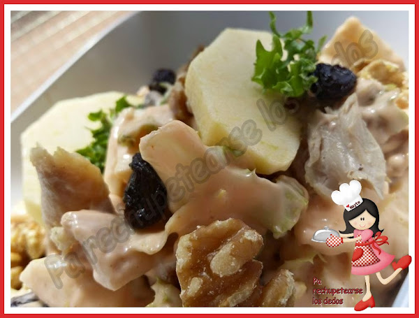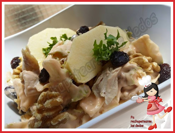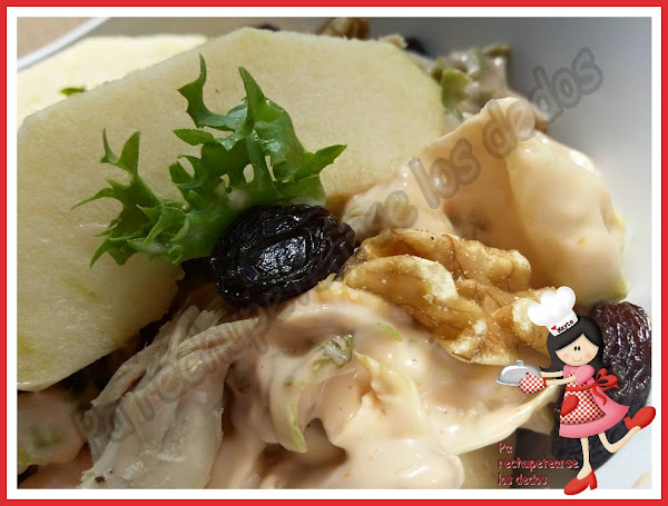 - En un bol, echa la escarola, el pollo troceado, la manzana picada, un puñado de nueces y de pasas. - Y por último,échale la salsa rosa. La cantidad la dejo a tu gusto.