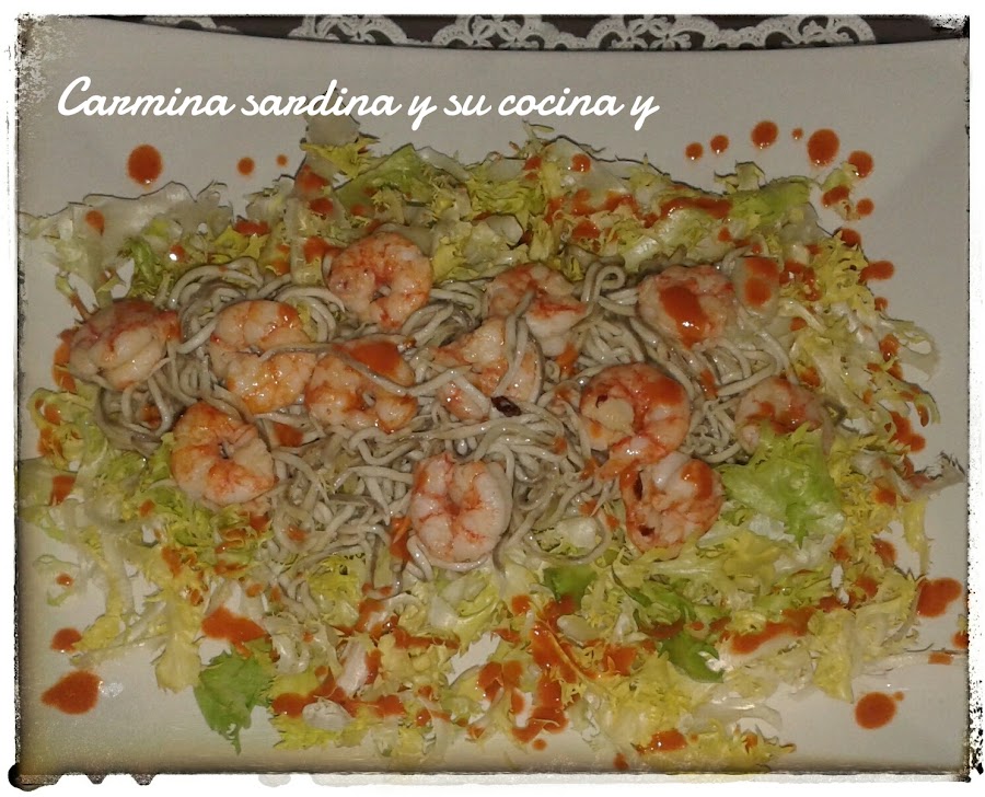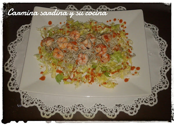 En una fuente colocar la escarola y sobre ella las angulas sucedáneas y las gambas.
