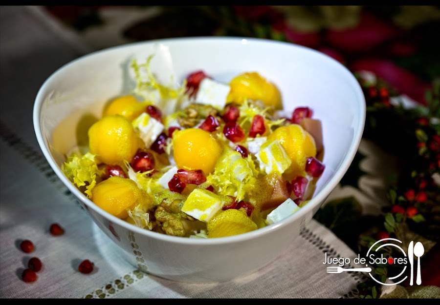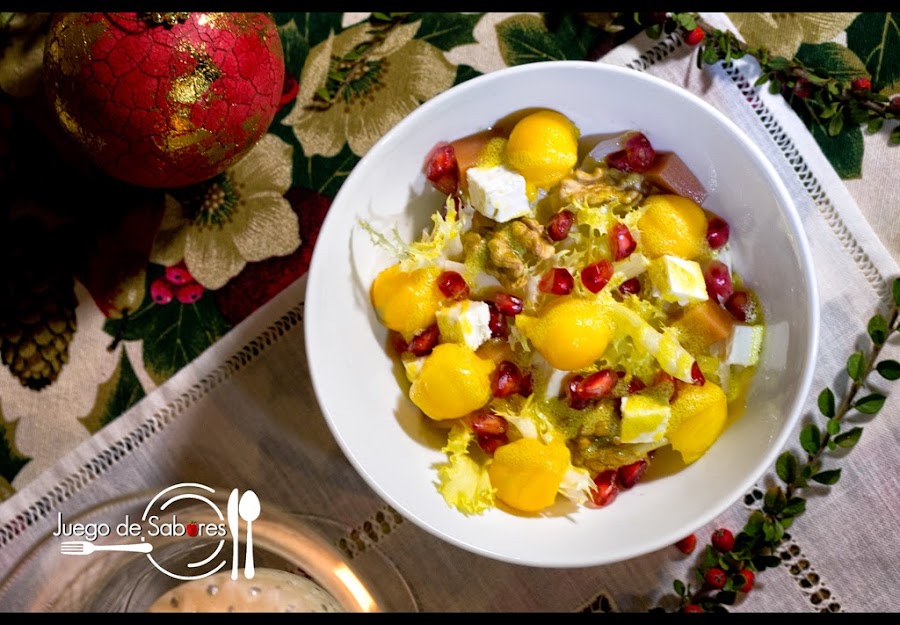 Con la llegada de un nuevo año todo el mundo suele confeccionar una lista de cosas que hay que conseguir a lo largo de los siguientes 365 días. Suelen encabezar esta lista propósitos tales como dejar de fumar, aprender inglés de una puñetera vez y apuntarte a un gimnasio para rebajar michelines. La lista se repetirá al año siguiente porque la fuerza de voluntad desaparecerá antes de que acabe enero. Ya lo advertíamos cuando hablábamos del turrón de chocolate blanco con frutos secos. Acabábamos la introducción diciendo: ¡Ya llegará la época del régimen, del "no me entra esta falda y estos pantalones ya no dan más de sí"! Pues bien, esta época ya ha llegado. De la operación engorde navideño tenemos que pasar a la operación biquini sin solución de continuidad. Después de tantas comilonas, ahora toca desengrasar. ¿Cómo? Pues, comiendo; pero comiendo sano. Ejemplo: una ensalada de invierno con un ligero toque tropical gracias a unas bolas de mango. El resto de ingredientes son de temporada: escarola, dulce de membrillo, granada y nueces. Todo ello aliñado con una vinagreta de aceite, vinagre de manzana y mostaza de Dijon. Fácil, ¿no? Pues, venga, manos a la obra que ha empezado la operación biquini.