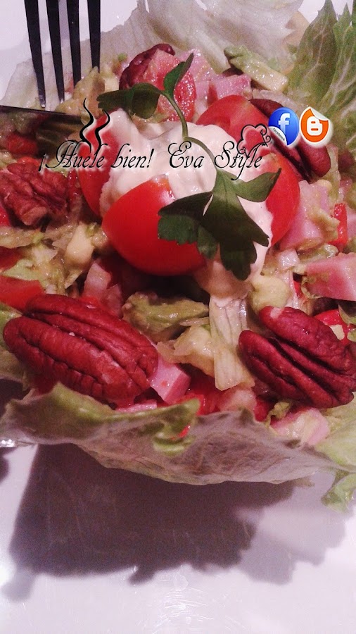 1.-Lavamos bien las hojas de escarola y los tomates, los secamos. Reservamos una hoja para utilizarla como recipiente. Picamos el resto junto con los tomates. Cortamos el dados el jamón.