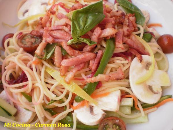 Espaguetis (suelo usar de la marca Gallo al huevo, la cantidad que suelo usar es la que agarrándolos cierro la mano, una vez por cada comensal), un pimiento verde, un trozo de pepino, ocho tomates cherries, un trozo de zanahoria, un trozo de remolacha cocida, dos champiñones, medio paquete de bacon ahumado cortado en tiras (se encuentra en cualquier supermercado), una ramita de albahaca fresca, la cáscara de medio limón, el zumo de un limón, seis cucharadas soperas de aceite de oliva virgen extra, aceite de oliva para cocer los espaghetis, un poco más para freir el bacon y sal.