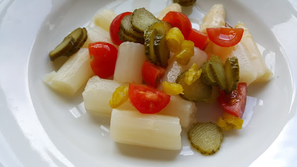 Lo primero que tenemos que hacer es escurrir bien los espárragos, yo los suelo poner sobre papel absorbente unos minutos para quitar la mayor cantidad de agua y que luego no nos ague la ensalada.