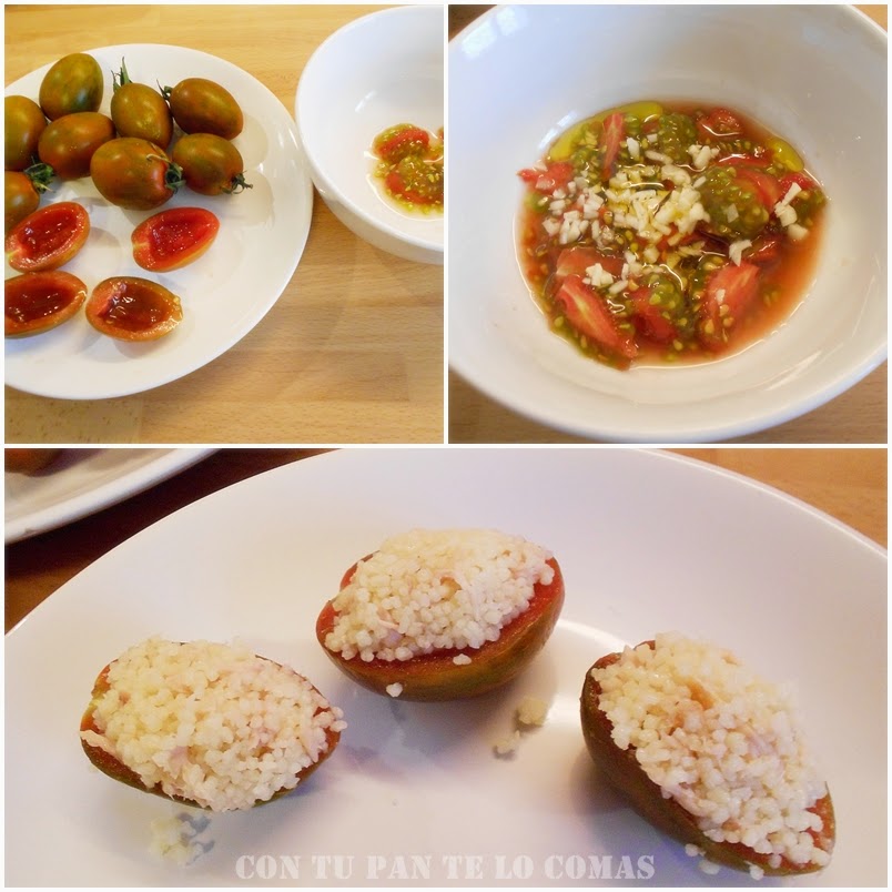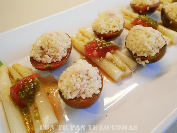 Como eran de ese tamaño enseguida pensé que eran estupendos para rellenarlos, y que un relleno sencillo de cuscús que también es pequeñito con atún tendría que resultar buenísimo. Y aunque son grandes para ser tomates cherry siguen siendo tomatitos y me parecía que les faltaba algo, así que he usado una latita de puntas de espárragos... y así todo en chiquitito me ha quedado una ensalada ideal, jajaja.