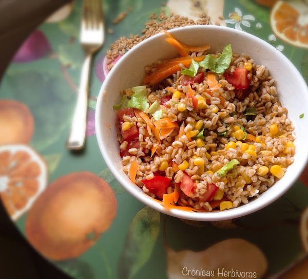 Pero si como yo, no os habéis sumergido en los misterios de hacer pan casero, hoy os propongo una solución para tomarla de una forma fácil y sencilla: cocida simplemente y añadida a la ensalada. Tenéis que saber que la espelta es una variedad de trigo (Triticum spelta) por lo que tiene gluten (así que los celíacos deben abstenerse).