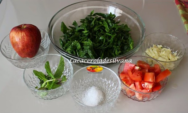 Lo que haré será lavar muy bien las espinacas, quitar la vena y cortarlas en julianas, luego cortaré en cubos grandes la manzana y los tomantes, pico finamente la yerbabuena y mezclo todos los ingredientes, al final le agrego el aceite de oliva, vinagre balsámico, sal y pimienta.