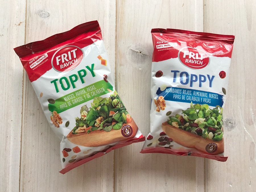 Por eso, cuando recibí la Degustabox de este mes {os dejo su contenido en este enlace} no dudé con qué producto elaboraría mi receta. Se trata de los nuevos Toppy de Frit Ravich, unas bolsitas que contienen una deliciosa selección de frutos secos, listos para añadir a nuestros platos favoritos y llenarlos de alegría y de buenos nutrientes.