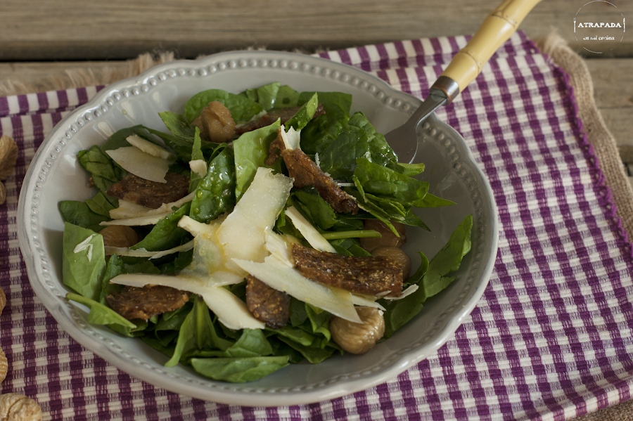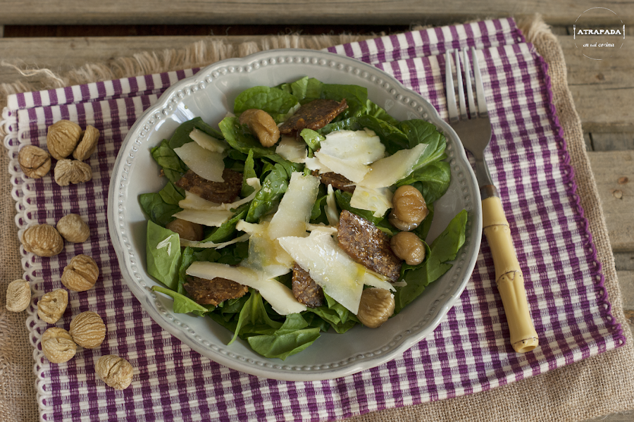 Se trata de una ensalada contundente, por contener queso, castañas y pan de higos. Podemos acompañar con cualquier pescado o carne a la plancha y será un almuerzo de diez.