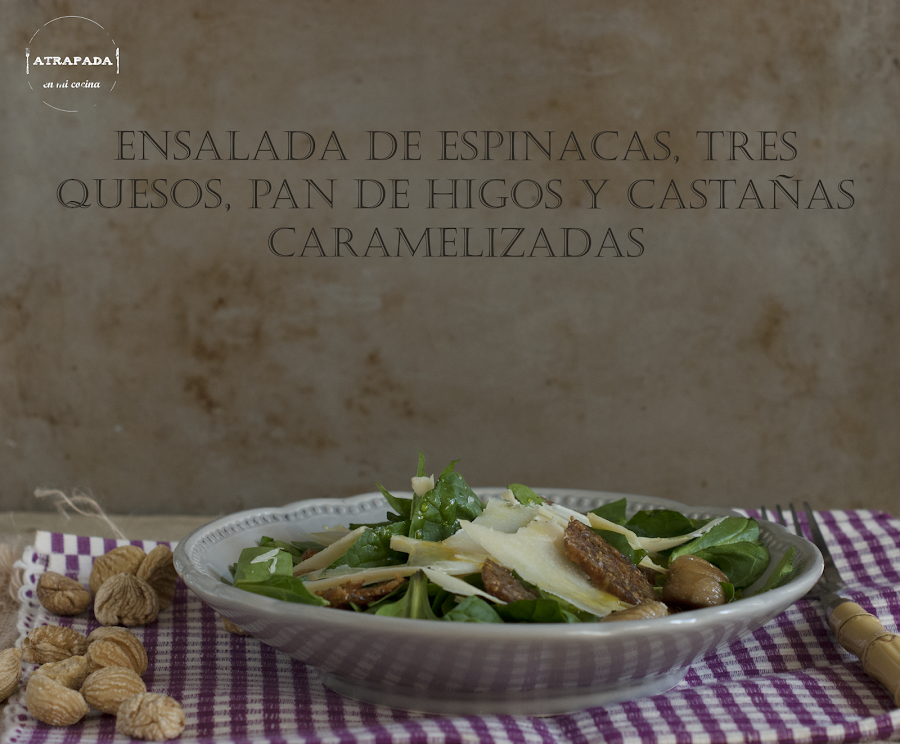 Lo primero que tendremos que hacer es caramelizar las castañas, para ello haremos un almíbar con la misma cantidad de agua que de azúcar (medio vaso de cada), una vez que empiece a hervir añadimos las castañas (que habremos hidratado en agua durante unas 24 horas, y hervido durante media hora), dejamos durante unos minutos dentro, hasta que se caramelicen. Sacamos y dejamos enfriar sobre una rejilla. Una vez frías procederemos a preparar la ensalada. Para ello disponemos en el plato las espinacas limpias y cortadas. Añadimos unas lascas de los tres quesos. Loncheamos el pan de higos y añadimos. También añadiremos las castañas caramelizadas. Preparamos una vinagreta con la sal, el aceite, el vinagre y una cuchara de miel o sirope dorado. Una vez haya emulsionado la vinagreta añadimos a la ensalada y servimos.