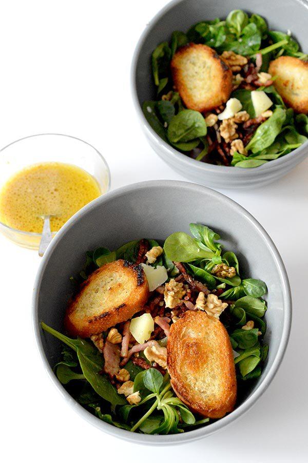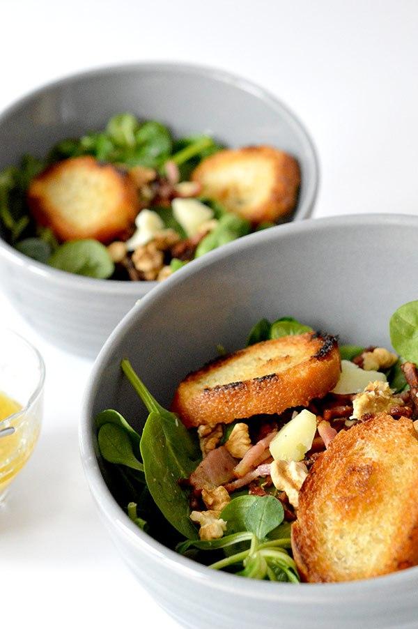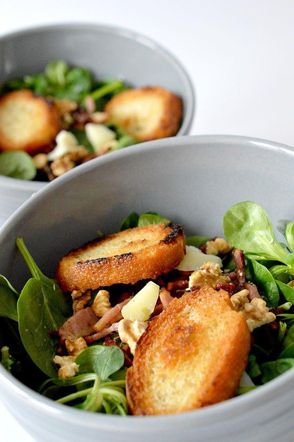 Er cierto que hace un tiempo alguien me digo que la lechuga no era muy digestiva y que era mejor sustituirla por otro tipo de hojas, como la rúcula, las espinacas y los berros así que ya casi nunca compro lechuga y me he aficionada a los sabores de estas hojas. Las espinacas están buenísimas en ensalada y las hojas mas carnosas para mi marcan la diferencia! La combinación con bacon crujiente con el queso azul y las cebolletas en vinagre es simplemente deliciosa! Esta muy bien aprovechar el mimo vinagre de las cebollitas para hacer la vinagreta!!