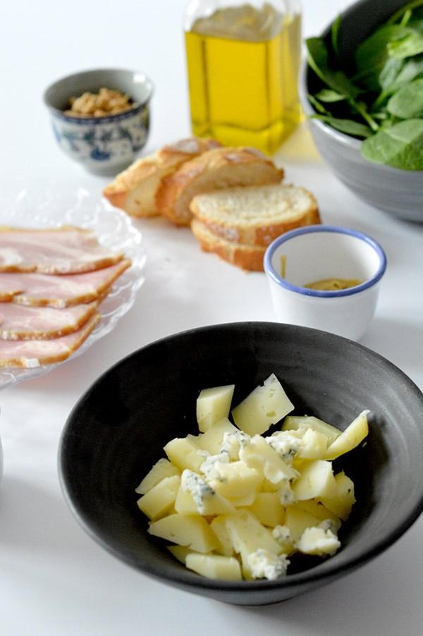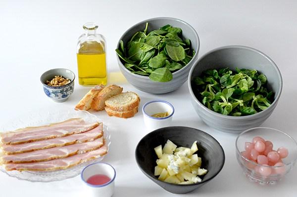 Colocamos en cada col una mezcla de espinacas y canónigos, junto con el queso cortado en trocitos las nueces y el bacon.