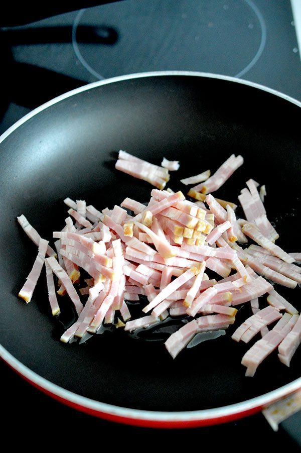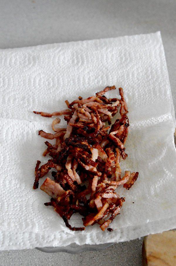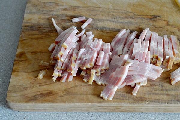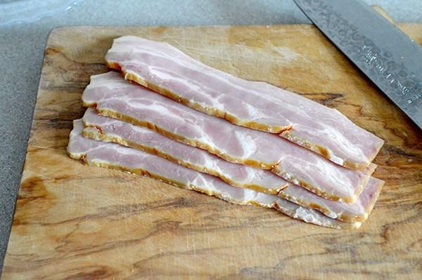 Lo primero de todo el quitar la piel del bacon y contarlo en bastoncillos.