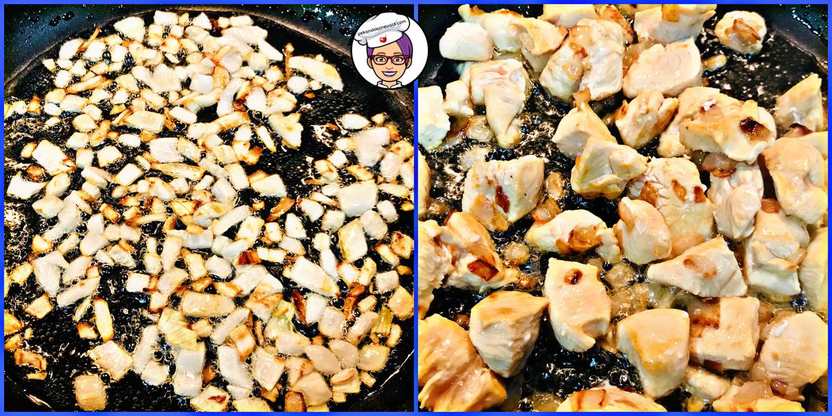 Picamos la cebolla y la freímos unos dos o tres minutos en una sartén con aceite de oliva, cortamos el pollo a cuadrados y se lo agregamos a la cebolla, lo salpimentamos y dejamos que se vaya haciendo a fuego medio cuando quede poco para sacarlo añadimos salsa de soja al gusto yo he puesto 1 cucharada y media (sopera)
