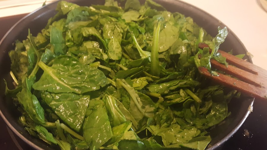 2.- En una sartén antiadherente, ponemos las espinacas cortadas y las vamos moviendo hasta que reduzcan, a fuego medio.