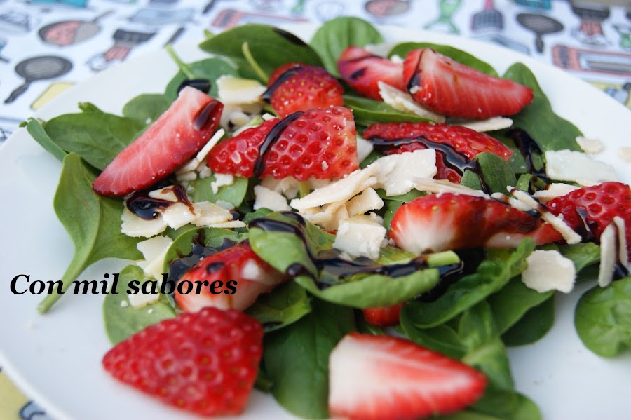 Cortamos las fresas en cuatro cuarto y las colocamos en un bol, ponemos en otro bol grande las hojas de espinacas (que ya están lavadas), añadimos los cuartos de fresas, y las lascas de queso. Por último aderezamos con sal, crema de vinagre balsámico y el aceite de oliva virgen extra. Y a disfrutar de uno de los grandes placeres de la vida!!!. Buen provecho amigos!!!!!!.