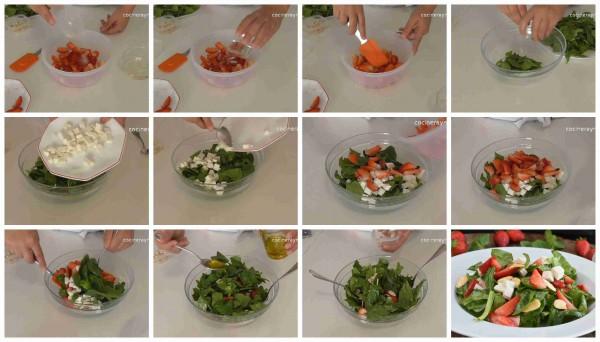 Añadimos a las espinacas el queso de cabra que habremos cortado en taquitos y seguido las fresas con el jugo que hayan solatado; le echamos una pizca de sal y mezclamos.