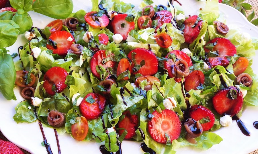 Ensalada de fresas y brotes tiernos con anchoas, queso de cabra y albahaca