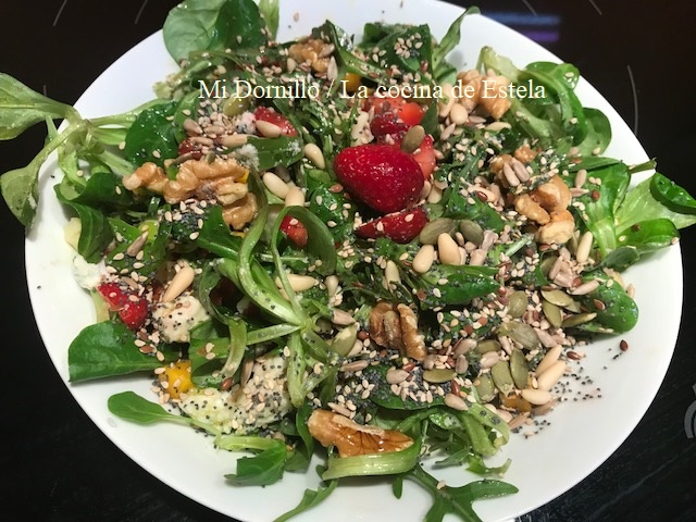 La verdad que la receta escogida no es nada difícil, pero si os aseguro que es una ensalada exquisita y que haré mucho en este buen tiempo que ya nos llega. Yo solo he cambiado las avellanas por otros frutos secos y le añadí unas semillas.