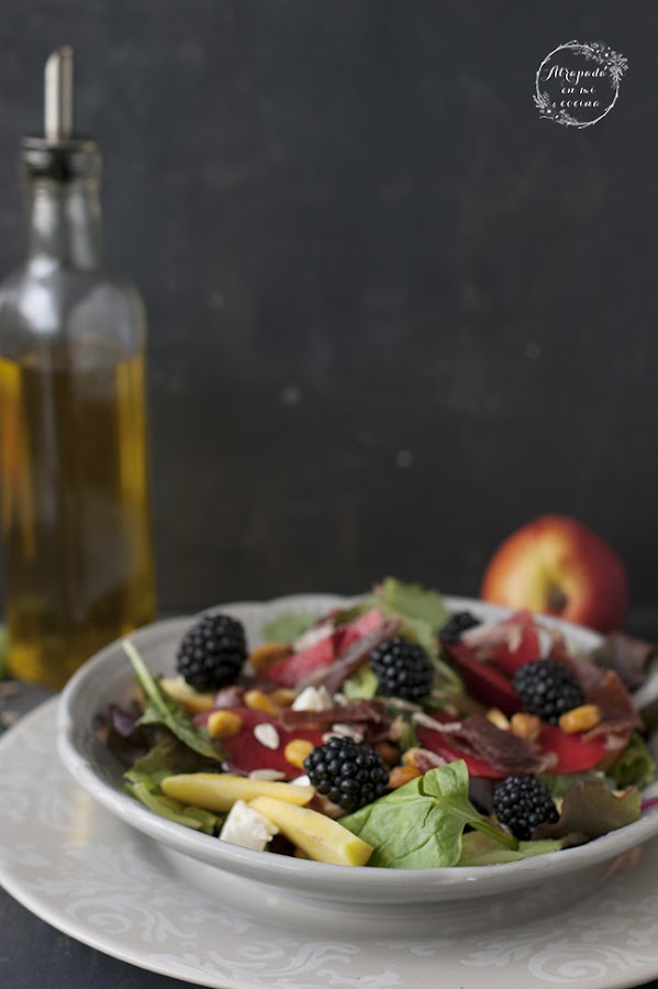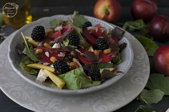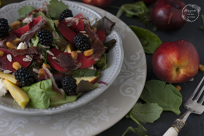 Martes y seguimos con mucho calor, por ello para mi las opciones perfectas para las comidas son las ensaladas, siempre diferentes, y hoy una con mucha fruta, frutos secos y jamón ibérico. Una ensalada completa ideal para aprovechar la fruta que tenemos de temporada. Y con esta ensalada participo en #Ponunaensalada2016 que organiza Sugg-r and some Salt